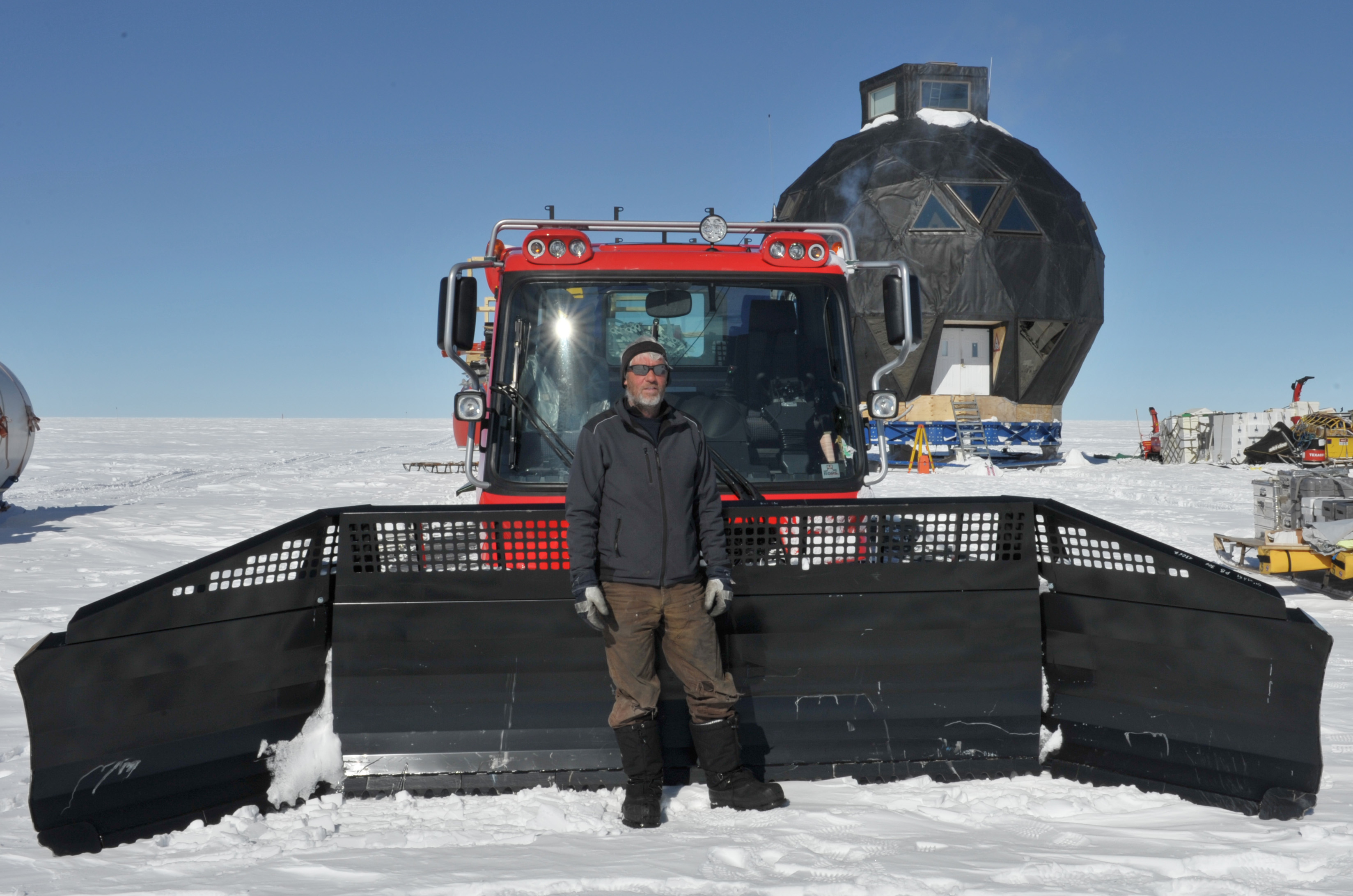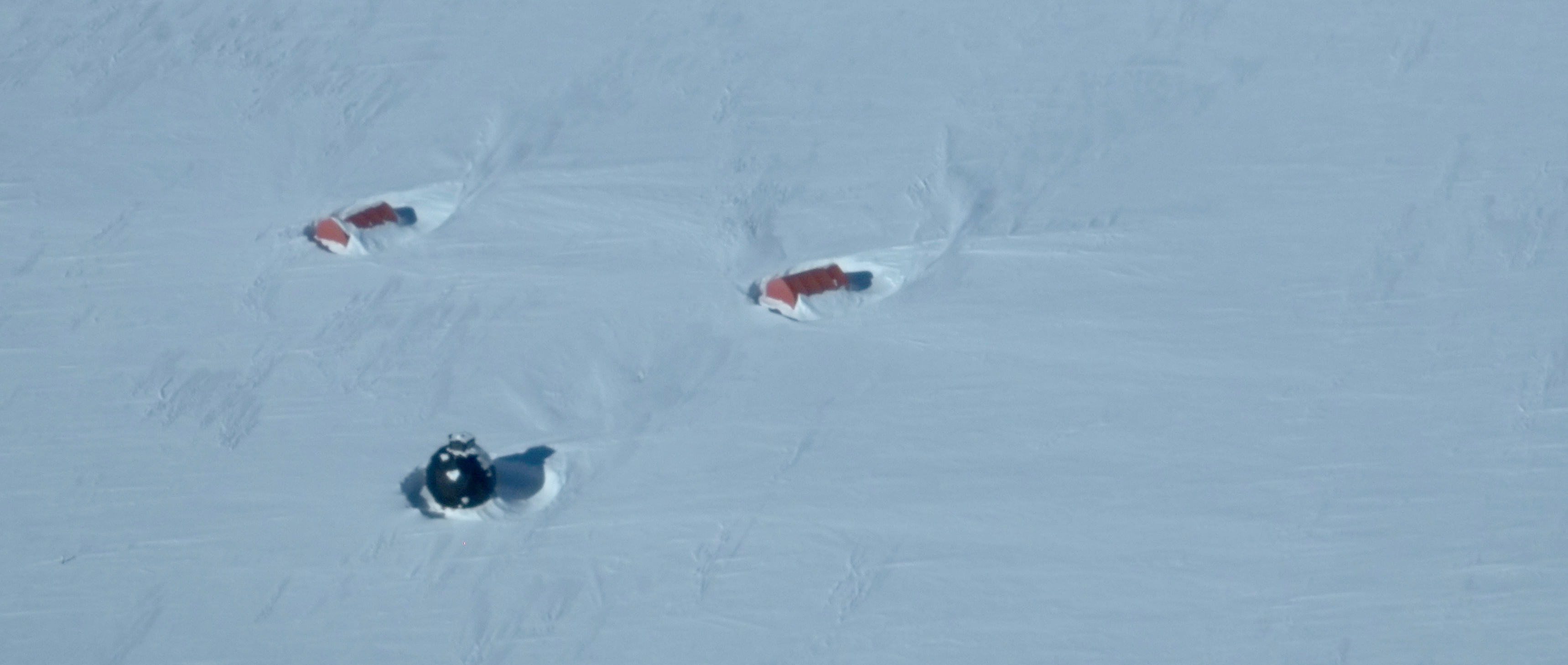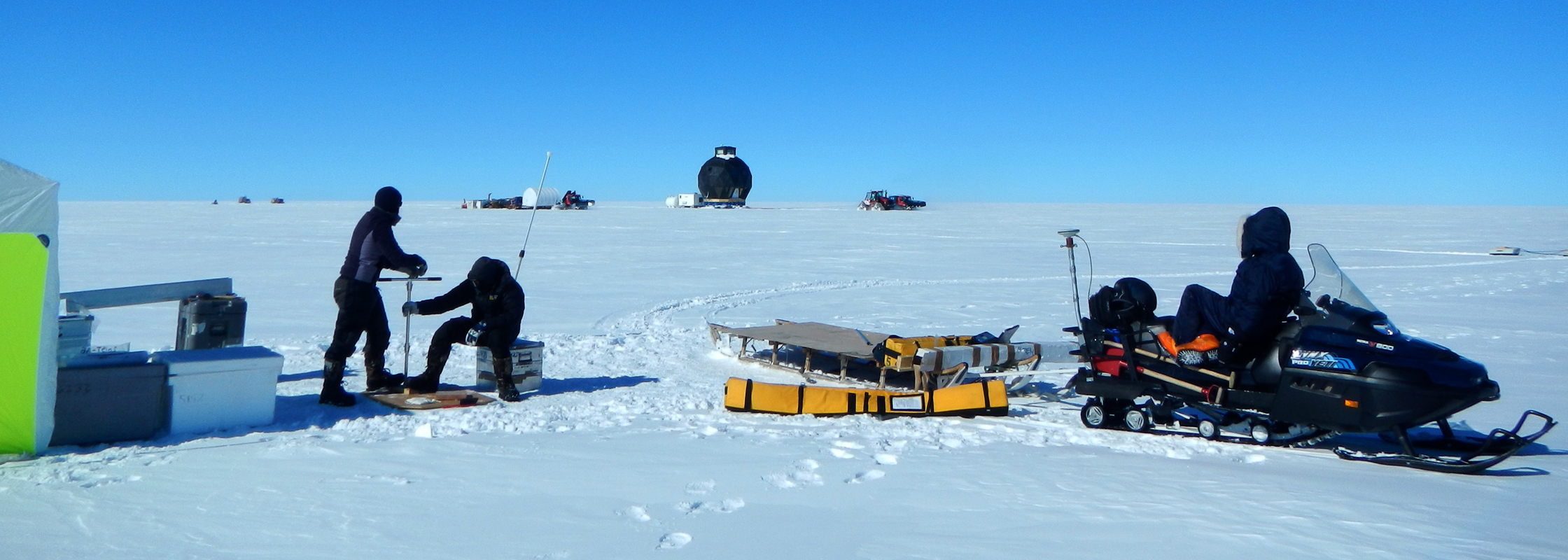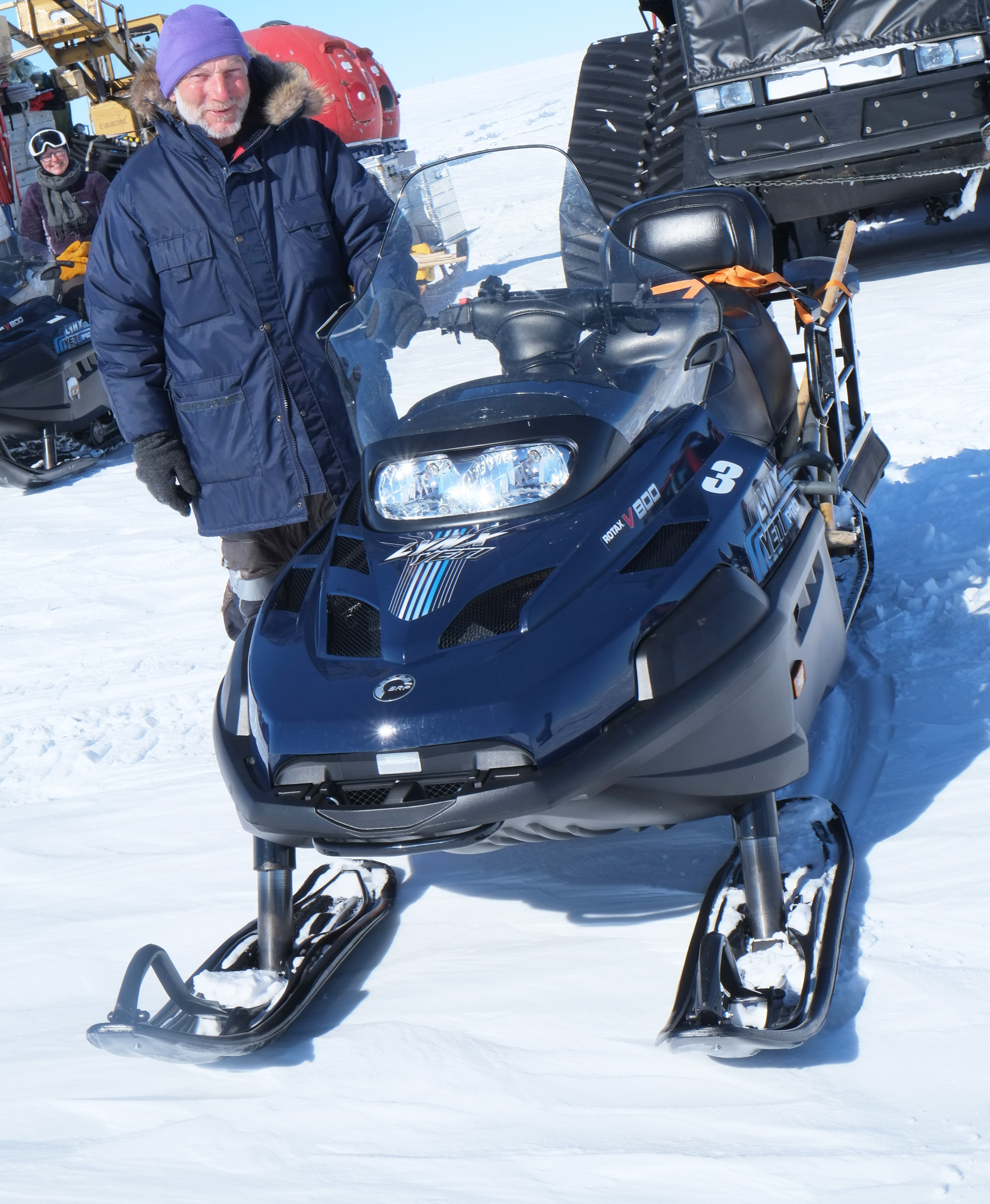Helle and Paul are taking snow samples, while Anna is watching the traverse train go by. To the right the snowmobile with radar equipment is seen