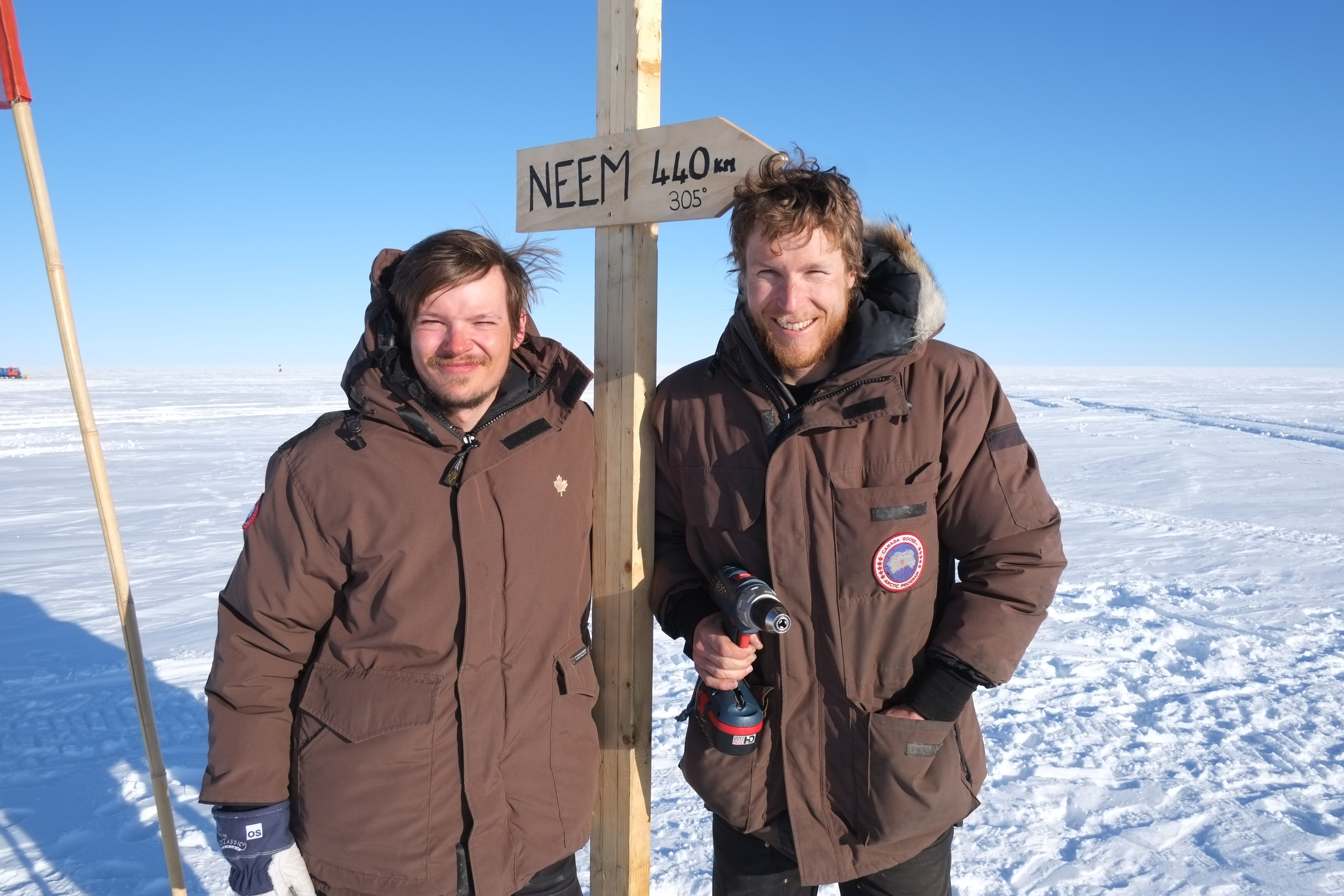 Mathias and Joel at the new road sign in the middle of EGRIP camp. It points to NEEM 440 km away
