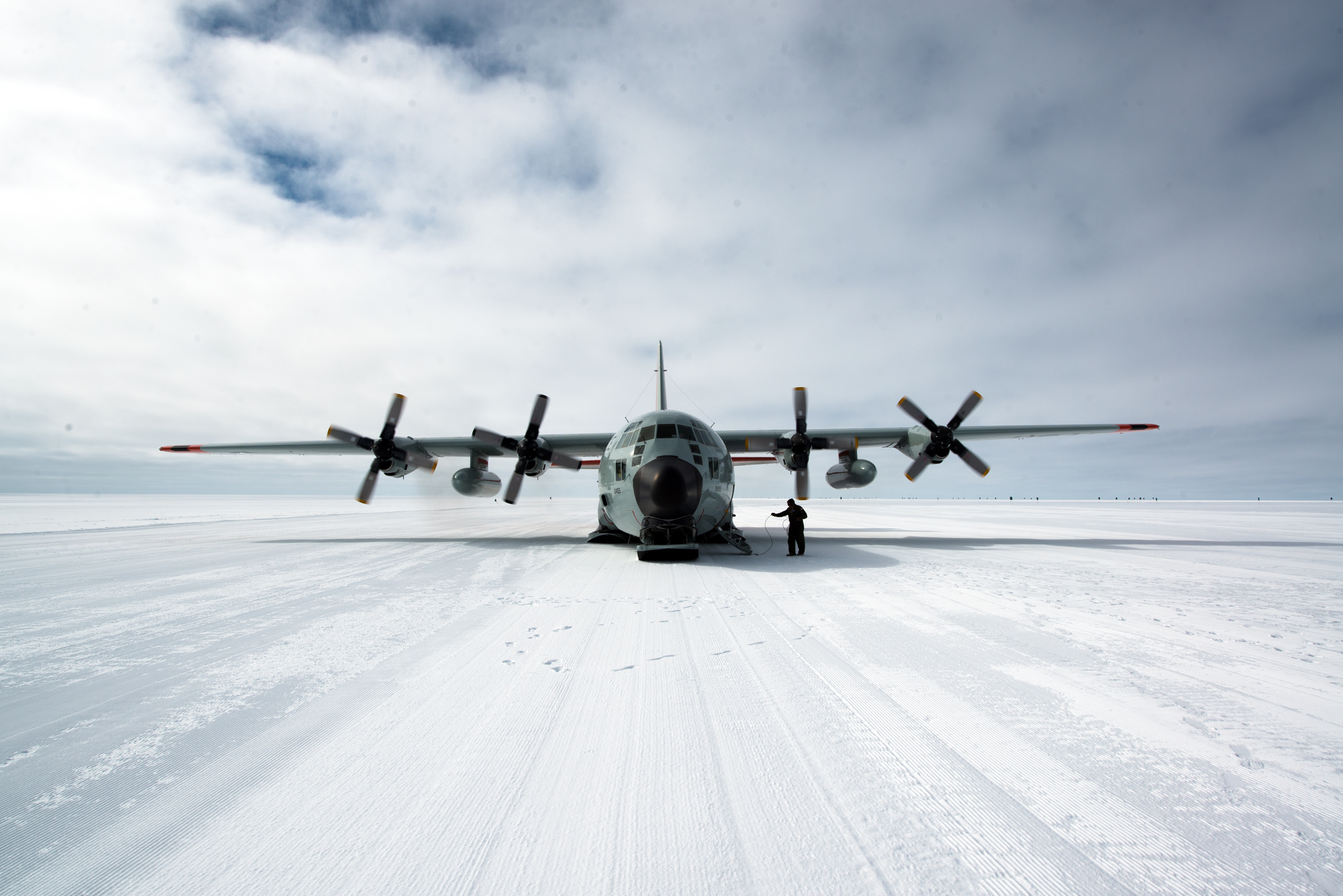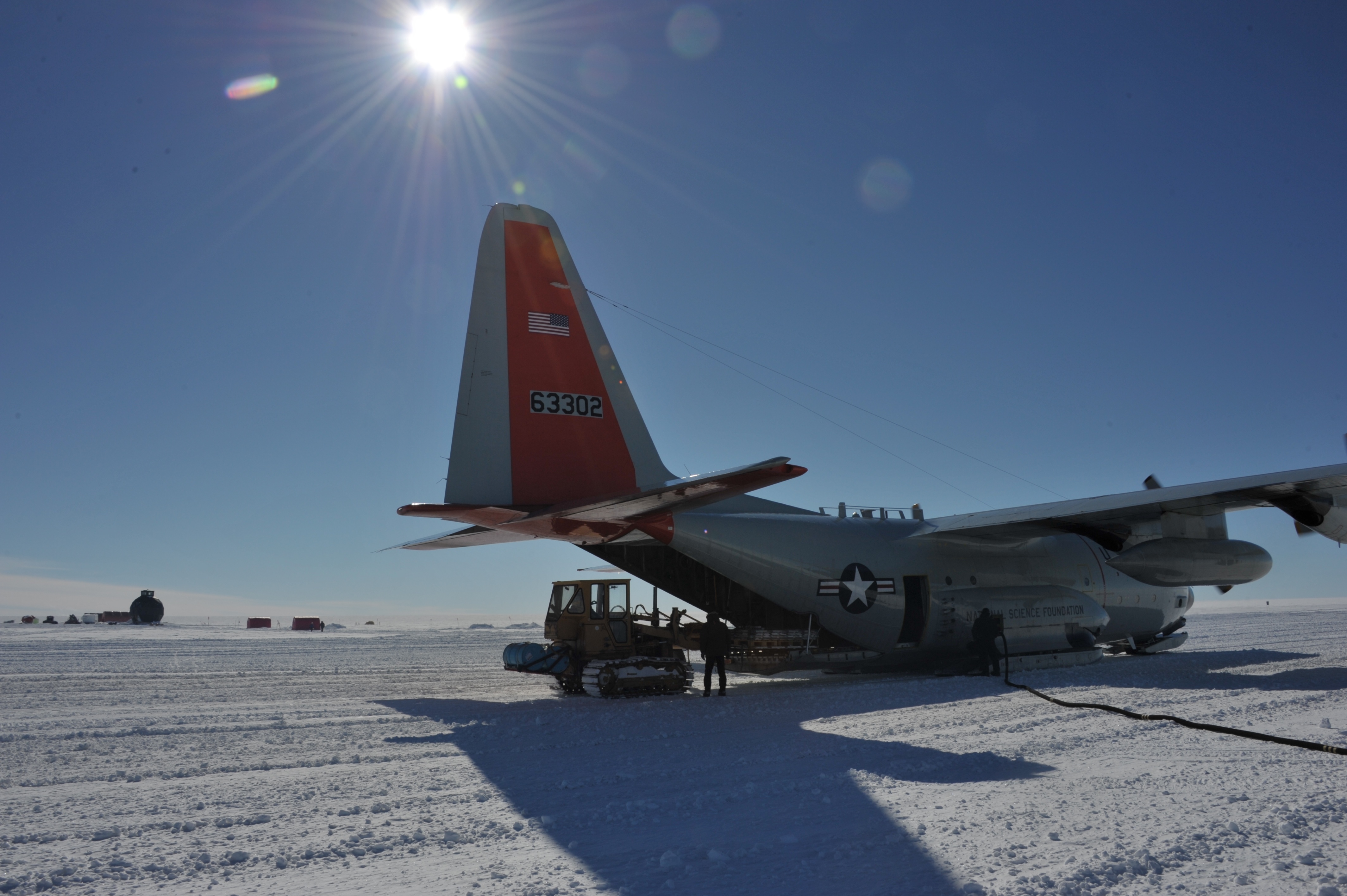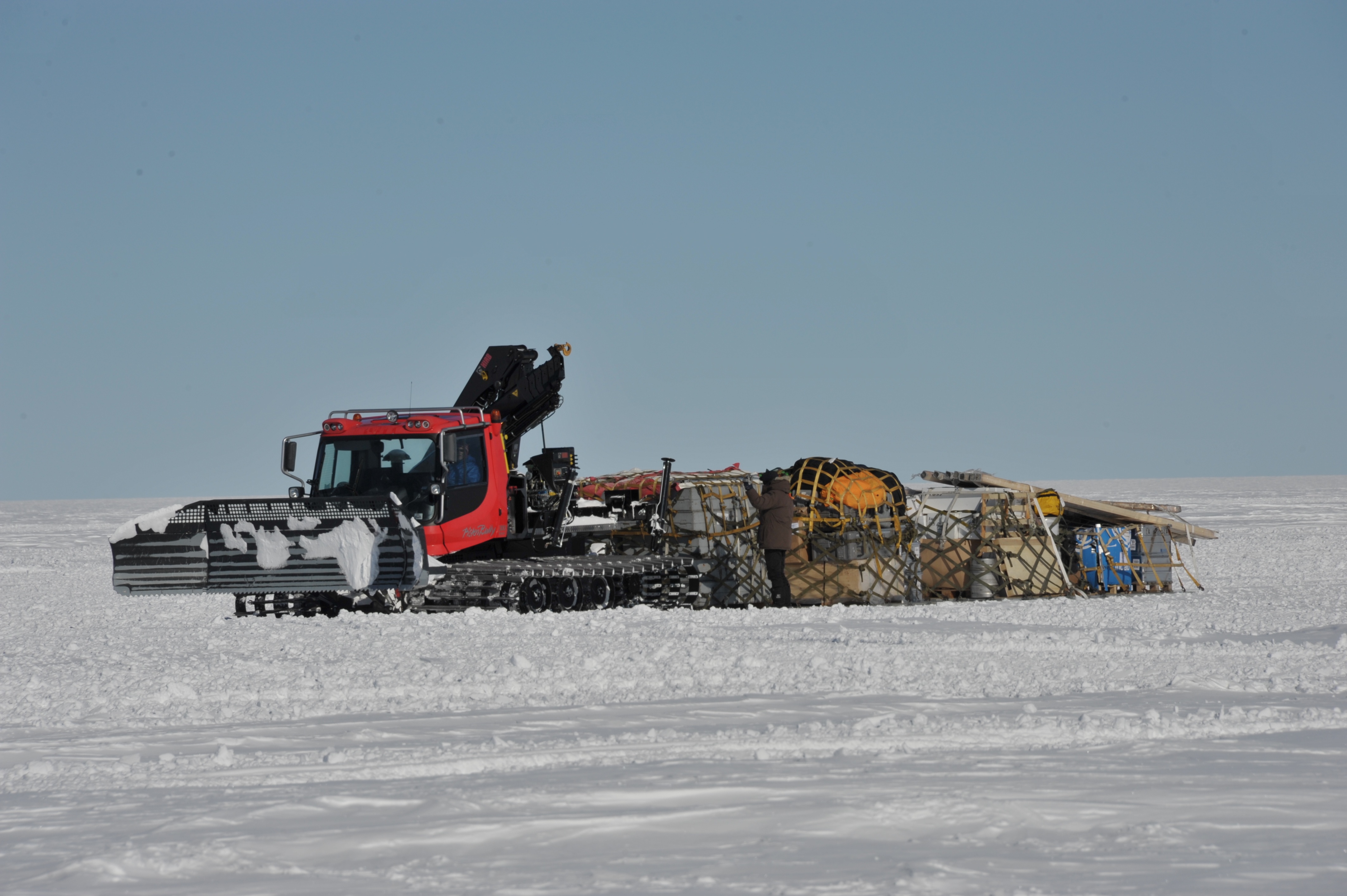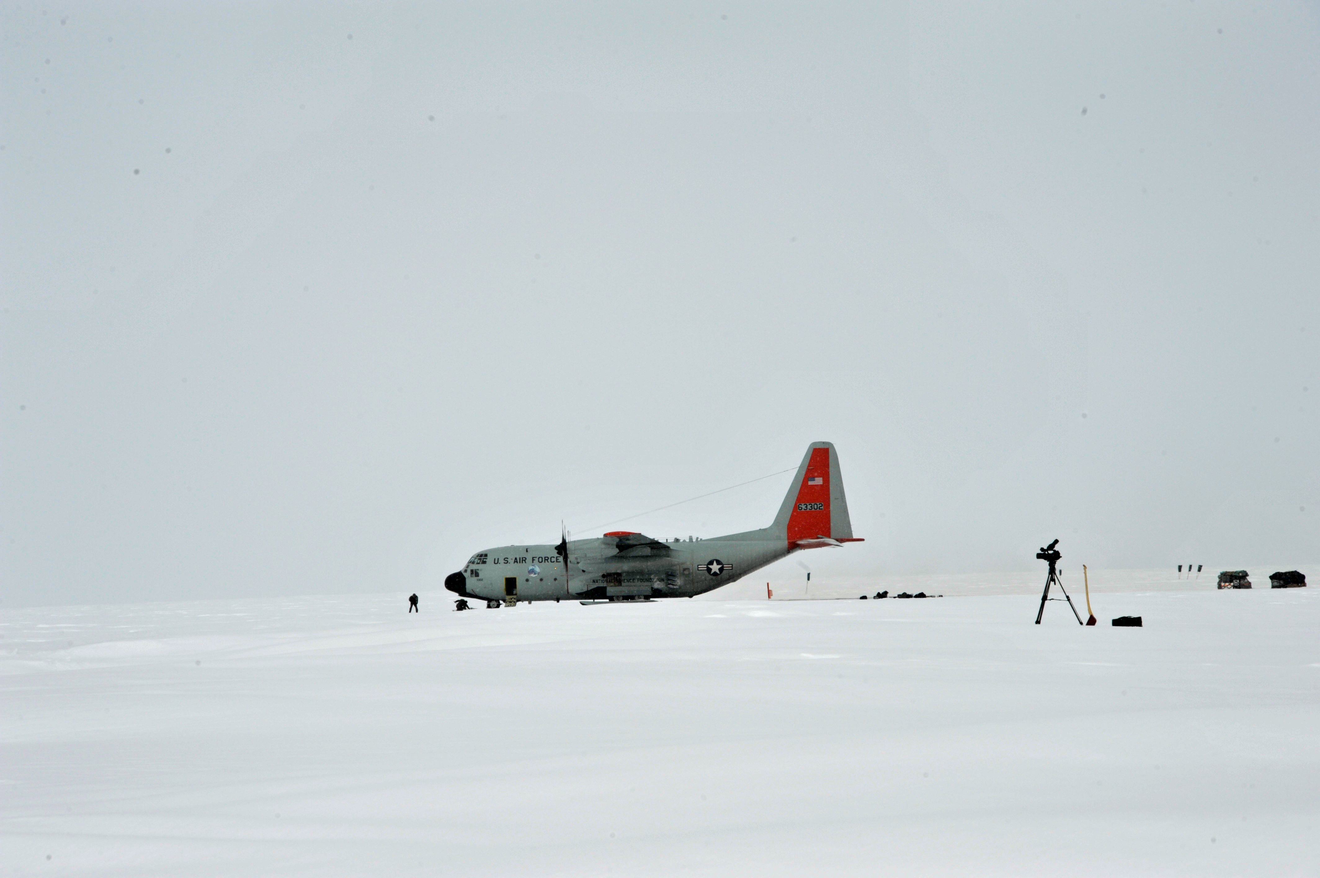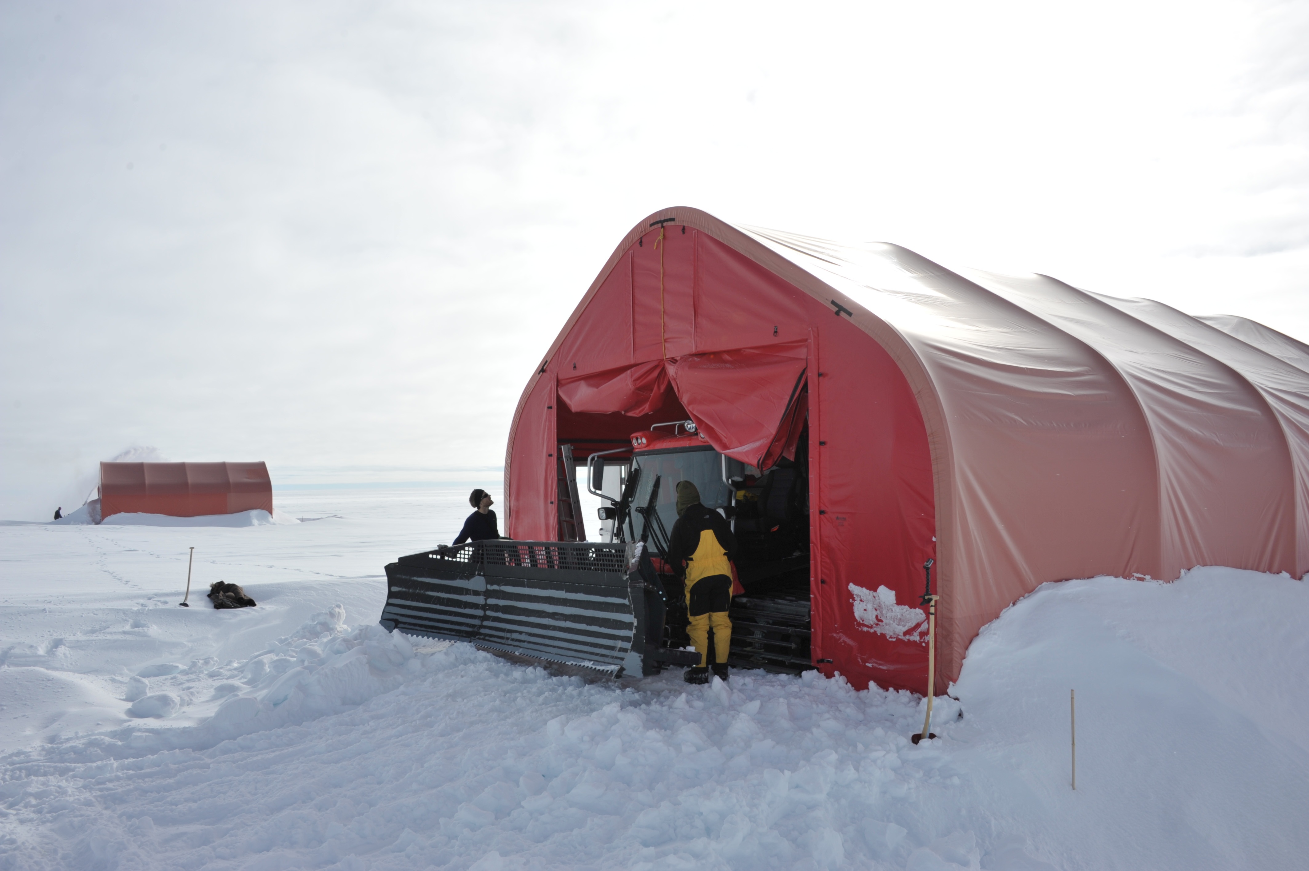 View from camp's main dome of 'Skier 02' as the first team of the season arrives to the empty camp